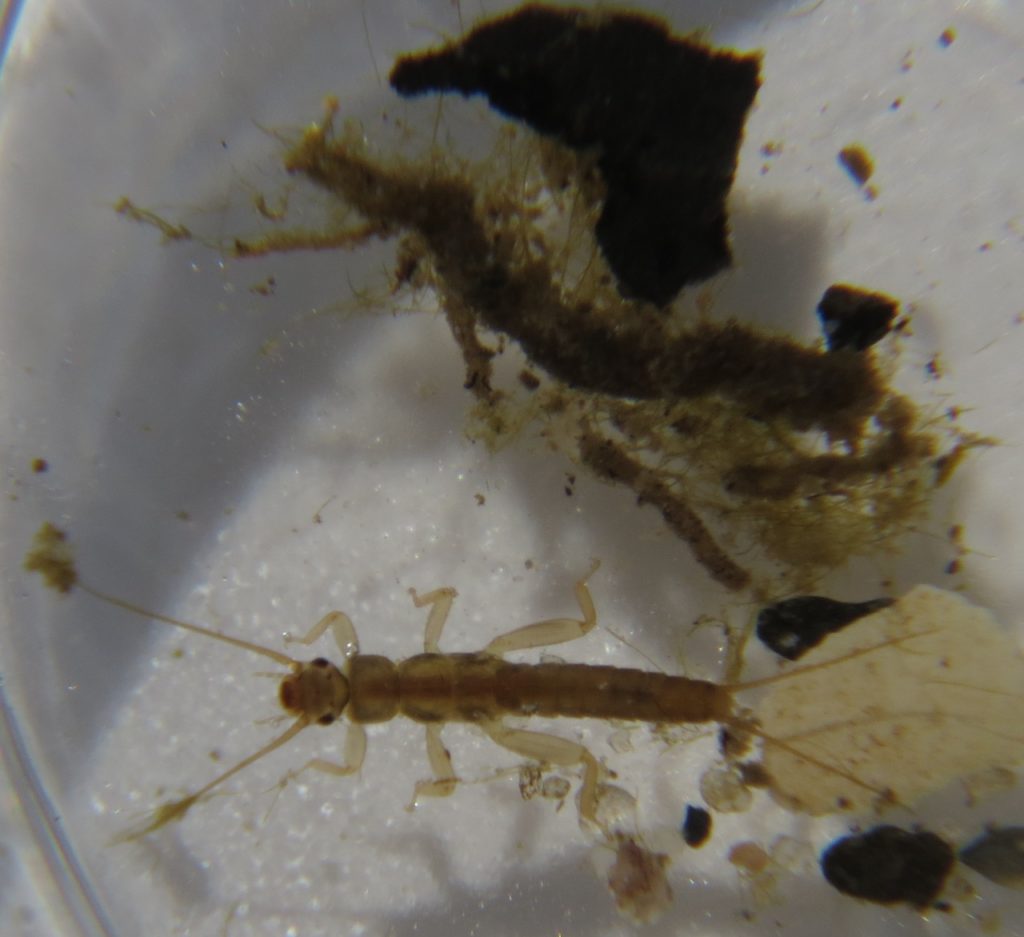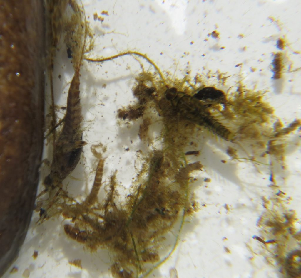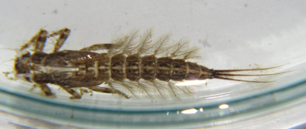 Diese Larve lebt in der Strömung. Sie ist platt und hat starke Haltebein.
