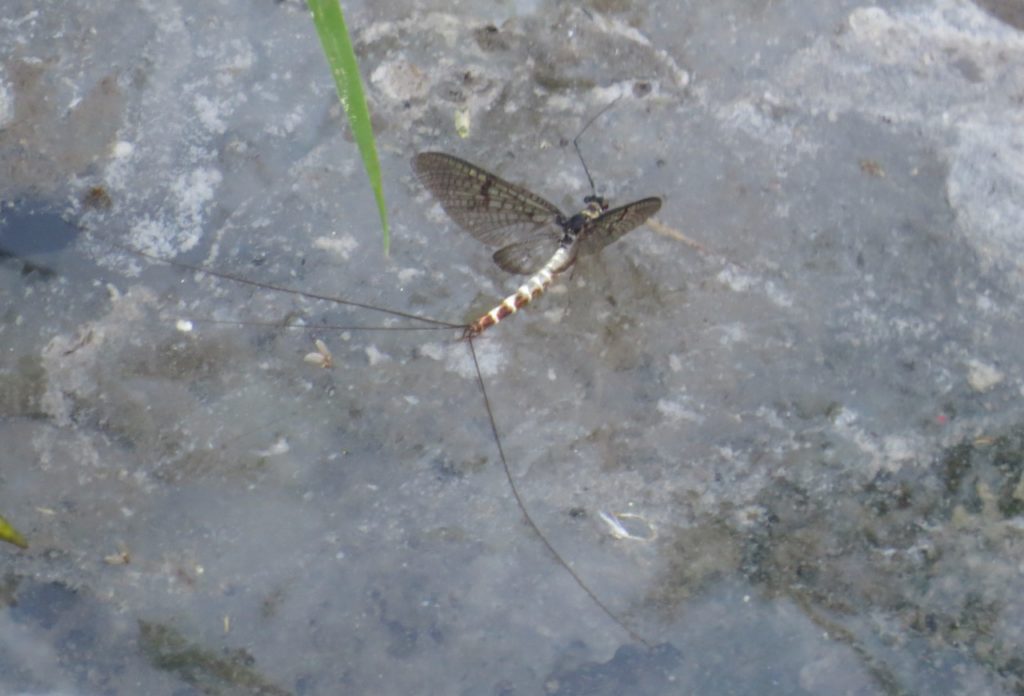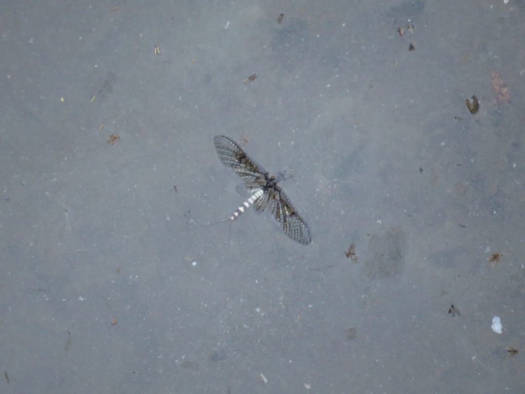 Das Schicksal der Dänischen Eintagsfliege (Ephemera danica): geschlüpft, gepaart, Eier abgelegt und gestorben. Gäbe es Fische in diesem Bach, wären sie gefressen.